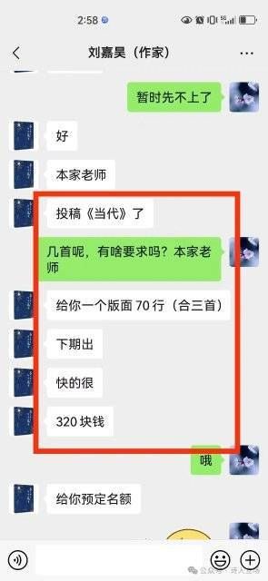 据了解,刘嘉昊打着和刊物杂志合作、“邀请组稿”的旗号,大肆发布收费上刊的信息,把付费组稿刊发变成了一桩桩生意,涉及的刊物有《芒种》《作品》《躬耕》《安徽文学》《鸭绿江》《滇池》等等。