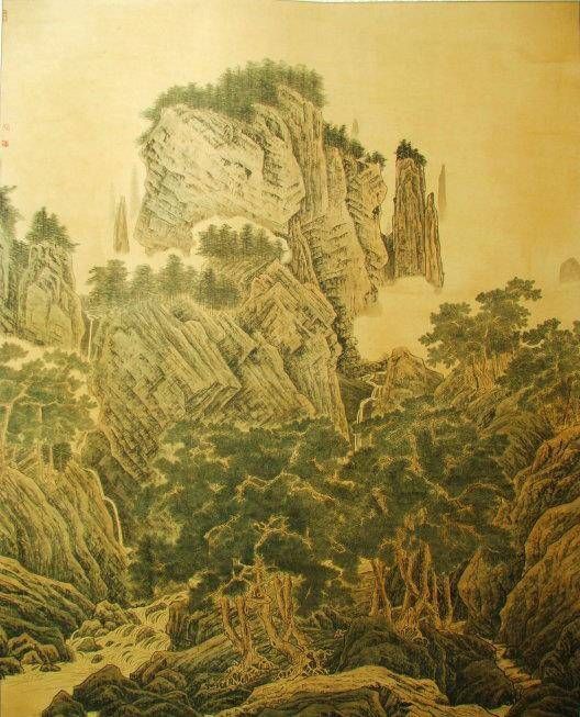 “斧劈皴”顾名思义,当然是斧头劈出来的味道,强调斧凿的痕迹,其速度力量,仿佛你能亲眼目睹。在画技中属于阳刚的皴法。斧劈皴通常用来表现雄奇大山,真正鬼斧神工的味道。从毛笔的使用技法来说,可运用侧锋,相当于毛笔肚的位置,轻沾墨,微擦绢,便会形成斧劈的效果。