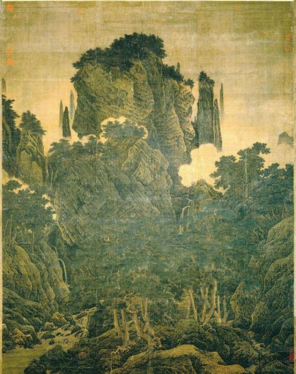 最后就是那几座如上帝削笔似的山峰。不同于主山密林,这些削笔峰,更显轻盈,墨色淡雅,细瘦飘渺,表达出一种虚幻山峰的意味。这几道直刺云霄的削笔峰,表现出李唐的浪漫主义情怀。