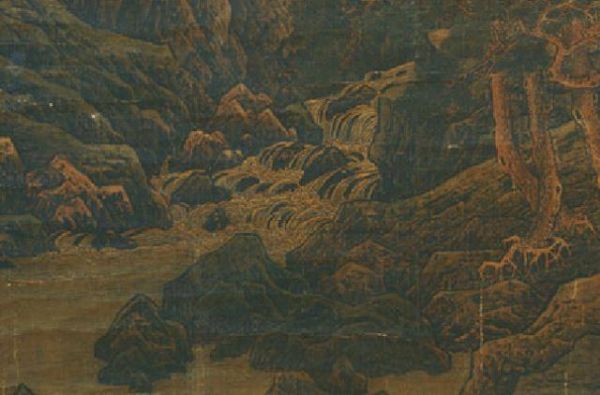 首先是山中瀑布、涧泉。远方山间流淌出的瀑布,延伸到画面左下方小溪,似断还连,让你清楚那道溪水与山上瀑布有连贯的关系。从静态画幅中,产生了动态,也让人听到了声音。