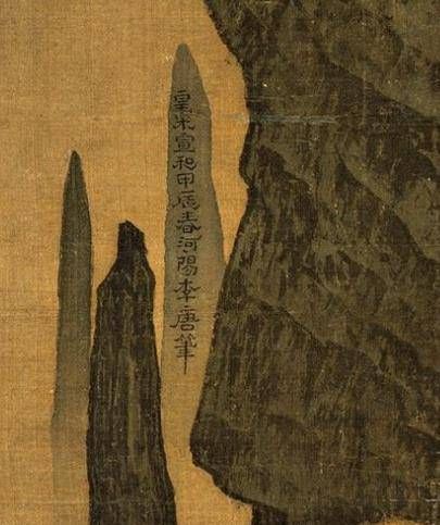 一般来说,北宋画家有个习俗。在画幅角落或隐密处留下自己独特的记号。这在艺术界很流行,中国的瓷器、西方的油画,都有这个习惯。在《万壑松风图》左方远山中,李唐在其中一座削笔峰留了“皇宋宣和甲辰春河阳李唐笔”,代表这件作品完成于宋徽宗时期,也就是公元1124年。当时李唐是徽宗画院中的任职画师,在当时文艺界也是一位大咖。