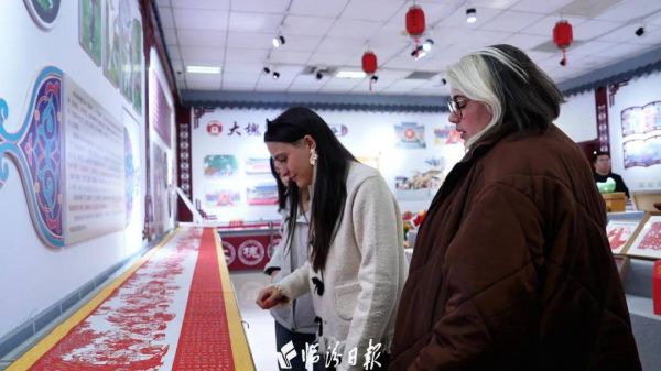 随后,一行人来到洪洞县文化馆,在非遗和文创产品展示厅,各种传统手工艺品琳琅满目,让人目不暇接。剪纸、刺绣、麦秆画……每一项技艺都承载着临汾人的智慧和汗水。临行之际,伊莲娜拿着洪洞县文化馆赠送的虎头刺绣胸针,激动地说:“这是我第一次来到临汾,当地人的热情和友善让我很感动,我会用镜头和笔触让更多的巴西观众领略到临汾魅力,并推荐更多的朋友来这里,让他们了解这个美丽的城市。”