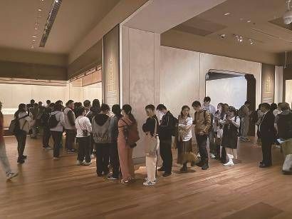 队伍中,还有人在排第二轮。“我早上10时开馆就来了,走了一圈又来排第二次。”队伍里,有观众正在翻看手机里拍下的《上虞帖》图片,“第一次看就想先抓紧时间拍下来,看得不够仔细。现在第二轮不用拍照,我可以静静欣赏。”不过也有人反其道而行之,一名观众表示自己先仔细看一遍,再拍摄自己感兴趣的地方,“这样目标更明确。”还有观众是一早从杭州赶来上海观展的:“浙江省博物馆正在举办‘问羽:宋代的自然与艺术世界’展,上博的书画馆也是‘常展特办’,生活在长三角对喜欢看展览的人来说幸福指数很高。”