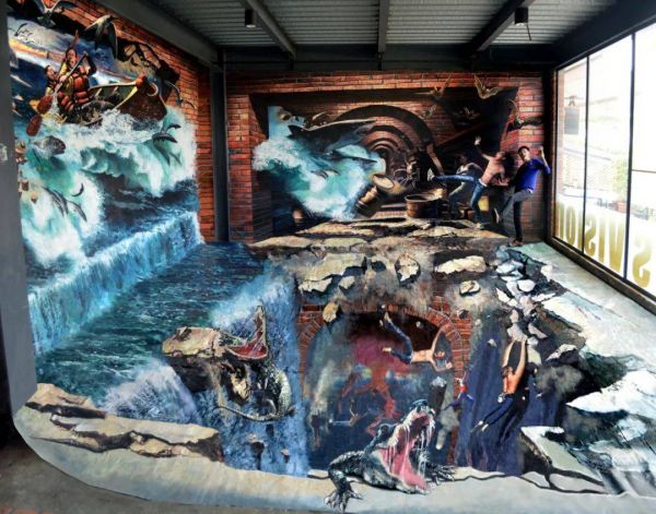 万以珩:刚毕业的时候,我们就接触了这种艺术,适逢网络风起,有一家公司找我们画3D画,这个作品被人放上网后,吸引来了更多的客源。3D地画来源于国外,是街头艺人以粉笔在地面画画的形式呈现,我们把它引进,也做了一些适当的优化,把这种艺术变成一种商业艺术,让它更适合中国的国情。我们的内容不断有创新,材料不断有突破,将一次性的粉笔改变为可以永久保留的材质,于是这种艺术可以应用到更多的场景,如户外、室内,甚至是公交车等。