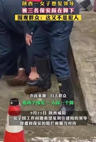 其中有两位穿制服的保安,分别死死地踩着女子的一只脚,