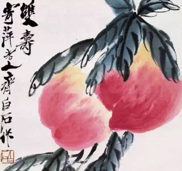 最后,主要也是因为齐白石老年时期画风的转变。尽管齐白石画中的桃子的外形有些像石榴,但是这也正是齐白石衰年变法的成功之处。当时的他,对事物的外形提出了“妙在似与不似之间,太似为媚俗,不似为欺”理念,让国画的格调真正达到了雅俗共赏的效果,既不流于媚俗,也不狂怪欺世,巧取了世俗与清高之间的审美意趣。可以说,这是齐白石画风转变的重要突破,而这幅名为《花实各三千年》的水蜜桃画恰恰体现了齐白石画风转变的特点。所以说,这幅画所蕴藏的绝非画本身这么简单。