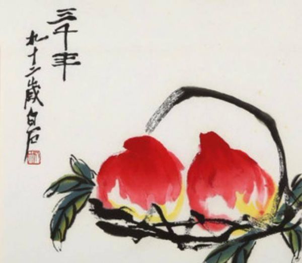 齐白石画过一幅《花实各三千年》的水蜜桃画:一株粗大的老树上,枝叶垂挂,4只水蜜桃奇大无比,外形看起来不像是水蜜桃,更像石榴的。千万不要小看这幅画,它竟然卖出3450万的天价。