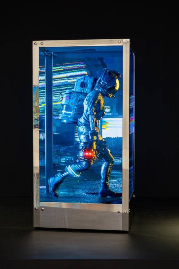 在展览的第三单元,被命名为“Welcome To 2122”的未来板块中,来自《每一天》系列的十幅作品以“油画+屏幕”的方式对照呈现,展示了技术发展带来的艺术观看方式的变迁,亦通过油画的形式促使观众驻足,对于作品背后值得全人类关注的重要议题展开思考。《指数生长》《人类一号》《S.2122》作为Beeple最具代表性的动态雕塑创作,分别矗立于展厅的三个单元,通过这些自主旋转的雕塑作品,Beeple持续地、实时地表达了自己对当前科技迭代背景下人类社会、技术与未知的未来之间的深刻见解。