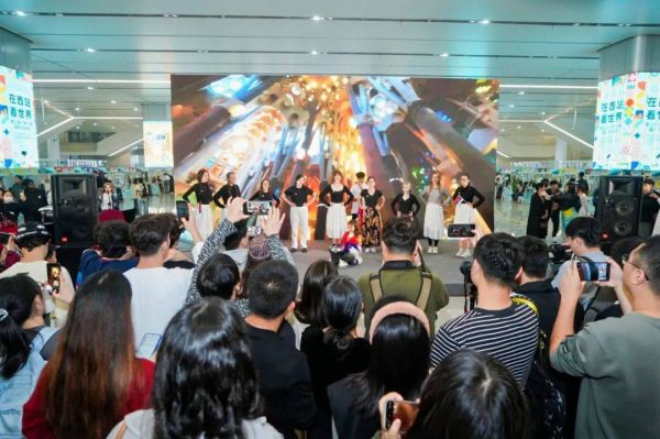 在精彩的歌舞表演中,文化节正式拉开了序幕。留学生们为大家带来了非洲现代舞、非洲鼓表演、印度尼西亚歌曲演奏、俄罗斯歌曲演唱等20多个节目,热情洋溢的舞蹈和形式多样的乐器演奏吸引无数过往旅客驻足,赢得了观众们的大声鼓掌和喝彩。台下坐满了从西站出游的旅客和附近居民,大家聚精会神地享受着这场异国文化盛宴,对“一带一路”文化交流有了更直观的理解。