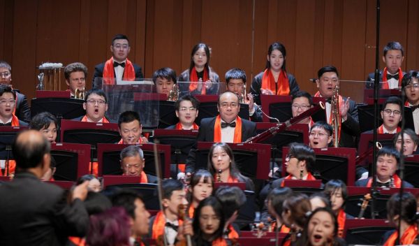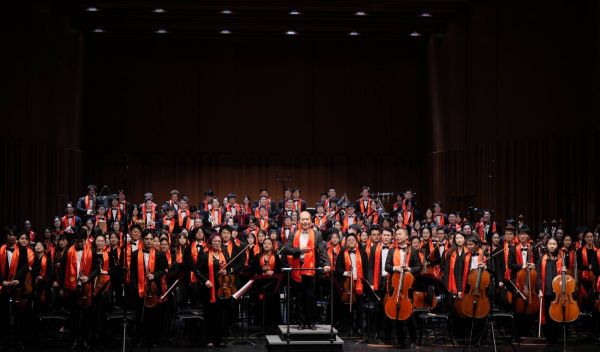 演出最后,逾300名上音师生和校内外演奏家们佩戴象征节日喜庆的红色围巾,献上由上音作曲家刘湲创作的《火车托卡塔》,共庆上音97华诞。