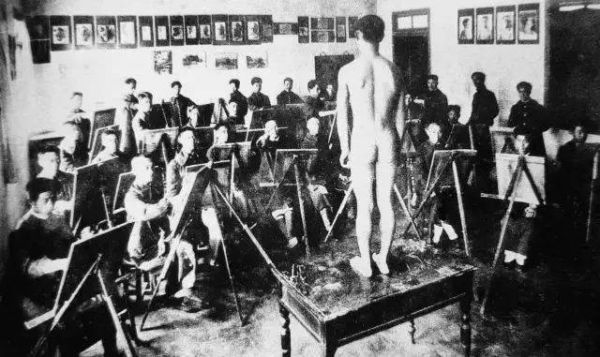 ▲1914年,李叔同在浙江省立第一师范学校采用裸体模特进行美术教学,开中国裸体美术教学之先河。后排右二站立者即李叔同。