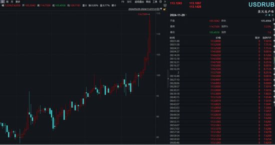 11月27日,俄罗斯卢布出现恐慌性抛售,卢布兑美元汇率盘中一度跌超8.5%,达到1美元兑114.75卢布,创出一年来新低;俄罗斯卢布兑欧元汇率也已跌破1欧元兑换120卢布,盘中跌幅一度超过9%。