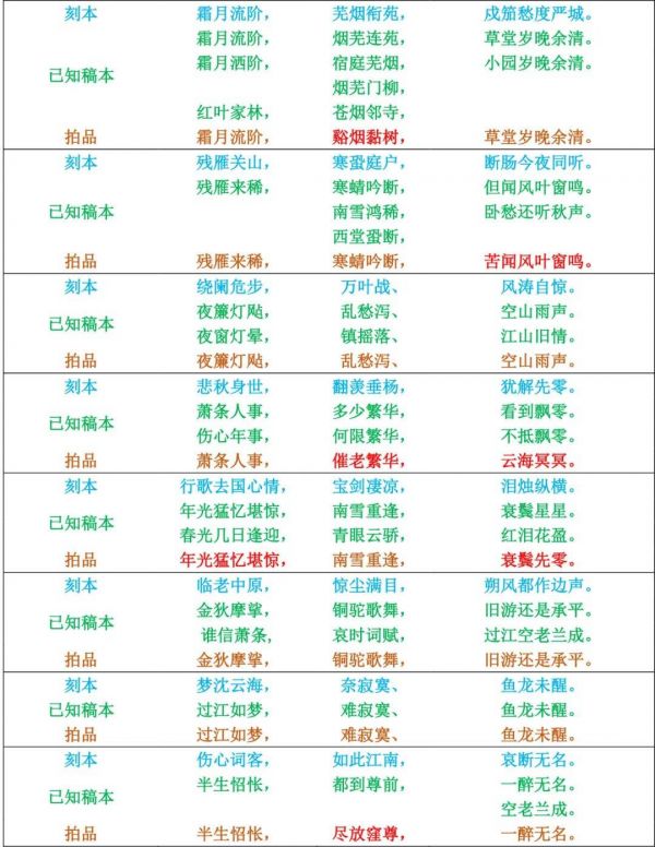 经对比发现,此册内的词稿多数与已知的稿本、刻本均不相同,或为新发现的一稿,对于“考察其创作的动态过程”有重要价值。取《庆春宫·同羁夜集秋晚叙意》一词进行比较:(刻本标蓝色,已知稿本标绿色,拍品标橙色,拍品与已知刻本稿本均不相同处标红色)