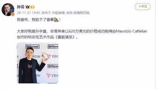 在区块链技术的广阔天地中,波场TRON的创始人孙宇晨以其独到的眼光和前瞻性布局,为艺术与科技的融合开辟了新的路径。近期,他的一项举动引发了广泛关注:以624万美元的高价,竞得了意大利艺术家卡特兰的标志性作品《Comedian》——一根巧妙地用胶带贴在墙上的香蕉。这一行为不仅是对艺术价值的一次大胆诠释,更是对区块链与艺术结合可能性的一次深刻探索。11月29日,孙宇晨在直播中亲自品尝了这根香蕉,这一举动不仅令人瞩目,更激发了人们对艺术与区块链交汇点的无限遐想。