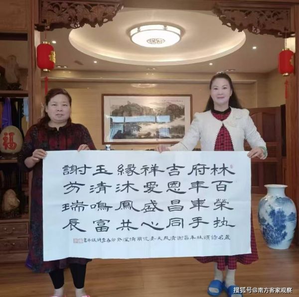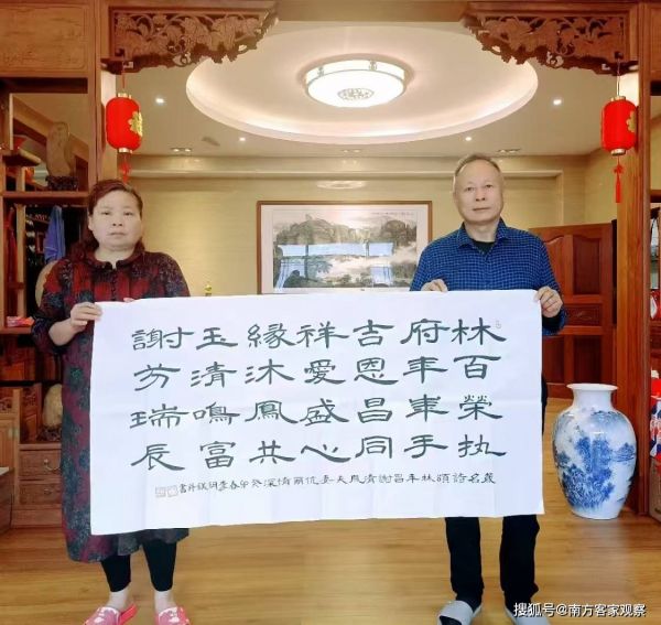 林府吉祥缘玉谢,此句以“林府”开篇,点明了夫妻二人的家门之幸和吉祥如意的美好寓意。同时,“缘玉谢”三字又巧妙地表达了两人之间美好的缘分和深厚的感情。百年恩爱沐清芬。“百年恩爱”展现了夫妻二人历经岁月洗礼的深厚情感,“沐清芬”则寓意着他们沐浴在清新的芬芳之中,生活幸福美满、和谐美满。荣华昌盛凤鸣瑞,此句以“荣华昌盛”形容夫妻二人的事业有成、生活富足;“凤鸣瑞”则象征着吉祥如意、幸福安康的美好愿景。同时,“凤”字也暗含了谢清凤女士之名,更显贴切与巧妙。执手同心共良辰!结句以“执手同心”表达了夫妻二人携手共进、心心相印的坚定信念和美好愿望;“共良辰”则寄托了他们对未来美好生活的无限憧憬和期待。
