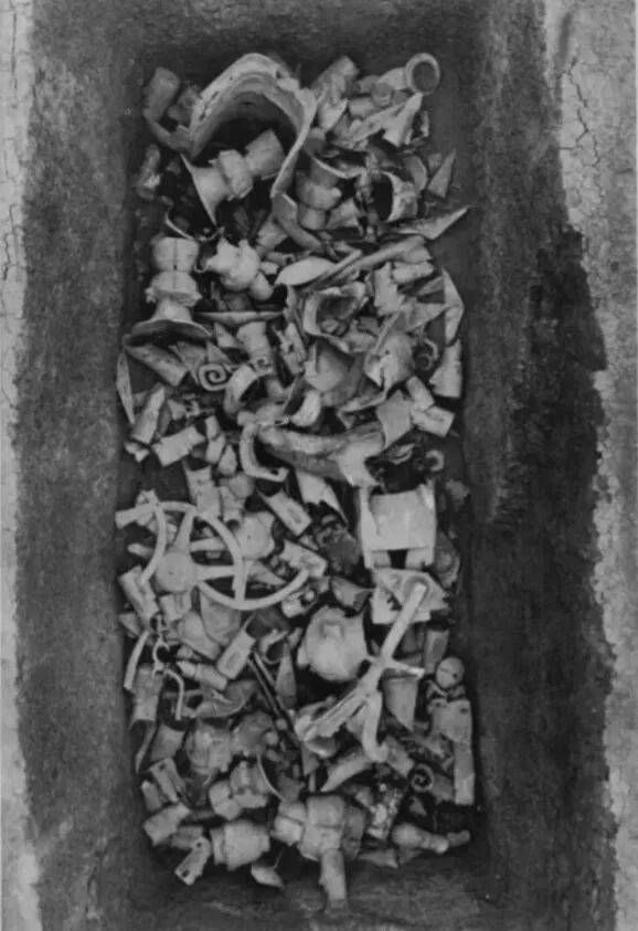 遗址一号祭祀坑内的器物相互叠压,遵循着一定的次序。首先投入玉石器,然后摆放大型青铜器,接着倒入焚烧骨渣,最后放着陶器和铜戈。坑内每一件文物都是祭祀所用神器。这些神器大都受损严重,除瘗埋过程中受压破损之外,均有焚烧的痕迹。玉器有风化或残缺的现象出现,同一件器物碎片分布在坑内的不同位置。