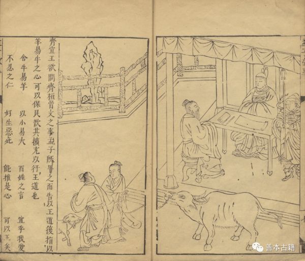 如《孟子全图》图7的故事来自《孟子·梁惠王上》的第七章,该章是齐宣王与孟子的对话,文段较长,主要谈论的是“保民而王”的话题,孟子在与齐宣王的谈话之中,先回避了齐宣王探寻“齐桓、晋文”霸道的问题,进而引入“王道”的话题,再称赞齐宣王有“以羊易牛”的仁爱之心,最后肯定齐宣王如果施仁政、保恒产的做法必然能够实现“王道”。该章文字集中体现了孟子的仁政、王道思想,虽然本章文字采取对话形式,读者理解起来相对不难,但如果没有相应的章句,也不利于广泛的传播,而采用像《孟子全图》一书中图文并行模式则能够收到意想不到的效果。在该图中,我们看到画面中孟子与齐宣王对坐在朝堂之上,堂下一人牵牛,一人牵羊,似正在以羊易牛,图旁文字云: