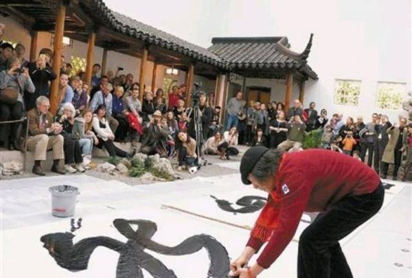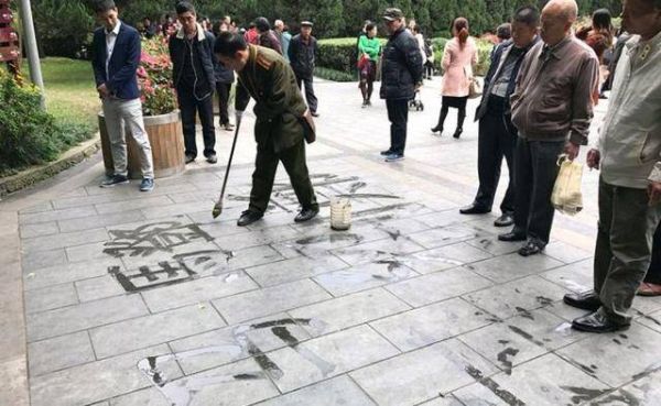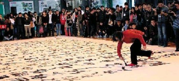 在围观者充满好奇目光的注视下,王冬龄挥动巨大的毛笔,他引人注目的红色袜子在白色宣纸上不断移动,一瞬间,一个个墨团在白色宣纸上晕开,一条条线条在纸上婉转。那一刻王冬龄写的是什么显得好像并不重要,他的大红袜子与他新奇的书写方式似乎比书写内容更能激发起人们的兴趣。看他挥动如拖把般大小毛笔的一瞬间,我的眼前忽然出现了许多在公园地上蘸水写字的那些老年书法爱好者们的身影。