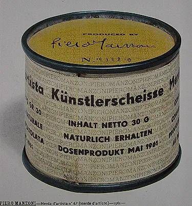 “当代艺术”的标志性作品就是杜尚的小便池(图2)。小便池都可以是艺术品,那么日常物品无不可以是“艺术品”。脏兮兮的床(艾敏),种花的花盆(雷诺),药柜子(赫斯特),甚至一坨屎(曼佐尼)(图3)……都可以是艺术品,并拍出高价。艾敏的床拍出2700万人民币,曼佐尼的一罐屎卖出100多万人民币!