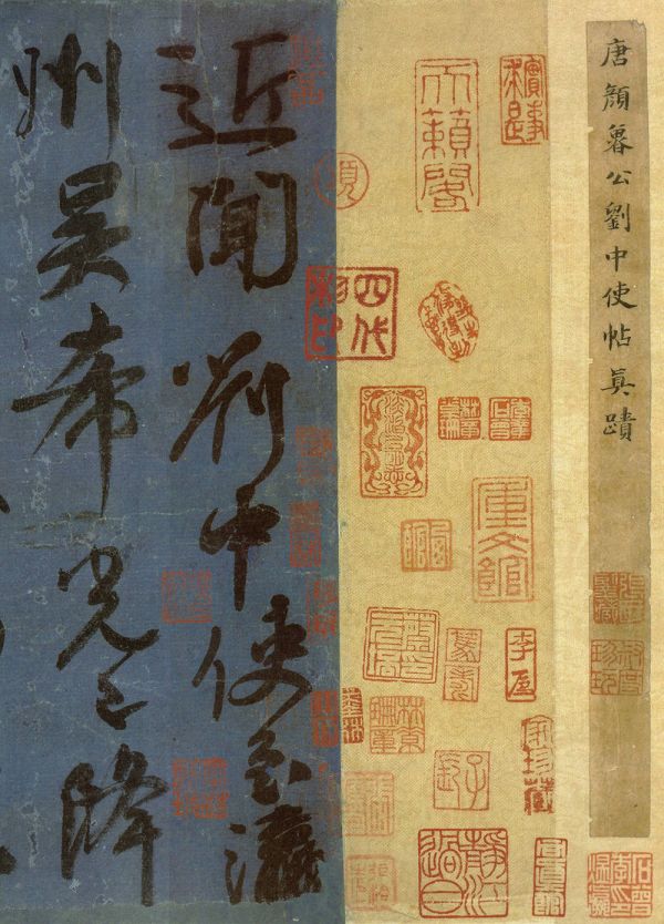 《刘中使帖》是颜真卿行草书中字体最大的作品。此帖流传有绪,据《清河书画舫》记载,它曾为宋宣和御府故物,元初藏于张可与家。帖后王芝题跋提到,至正二十三年(1363 年),王芝从张啸江处以陆柬之《兰亭诗》、欧阳询《卜商帖》易得此帖。明嘉靖间归项元汴 “天籁阁”,后辗转落入厂肆。民初归李石曾。帖内钤有 “三槐”“悦生” 二半印,“绍兴”“张晏私印”“王芝”“项元汴印” 等鉴藏印。后有元王英孙、鲜于枢、张彦清、白湛渊、田师孟及明文衡山、董思白等题识。明《戏鸿堂》帖亦有刻入。