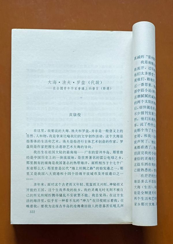 记得在1991年全国青年作家代表大会上,黄康俊有篇题为《大海.渔夫.罗盘》的讲话,我想引用其中一小段对他的艺术探求作点注脚:“我们知道,海洋在地球中占三分之二的位置,而海洋又是那么深奥莫测,既然大海是生命的摇篮、人类的故乡,因而相信每一个人就是一方大海,有关人的一切也同样深奥莫测。所以,探究这两种不同质的海就显得特别有意义。因着大海的神秘、深沉、博大,主张采用一种与之适应的手法来表达我所理解、感受的‘海’,我把这海作为一种广义的海来看待,不满足一般海类作品上那种单一的、浅层意义上的仅仅是对海的赞美或诅咒的文字,执意写出一个只属于我自己的‘海’来......”