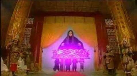 在佛母孔雀、黑莲使者、白象精、青狮怪的拥簇下,无天佛祖坐着七宝莲台,直抵大雄宝殿。