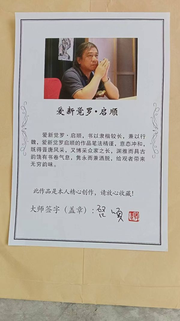 启顺的书法作品常被赞誉为蕴含着深厚的文化底蕴和皇者风范。他的作品不仅多次参加国内外重要书法展览,还曾多次被央视及地方电视台专题报道,广泛传播其书法艺术魅力。作为中国现代书画界的杰出代表之一,启顺在书法界享有很高的声誉。他的作品不仅具有极高的艺术审美价值,更具有极高的收藏潜力和升值空间。