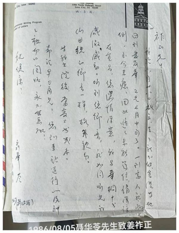 1986年8月5日,聂华苓从爱荷华给姜祚正来信,再次表示了感谢。