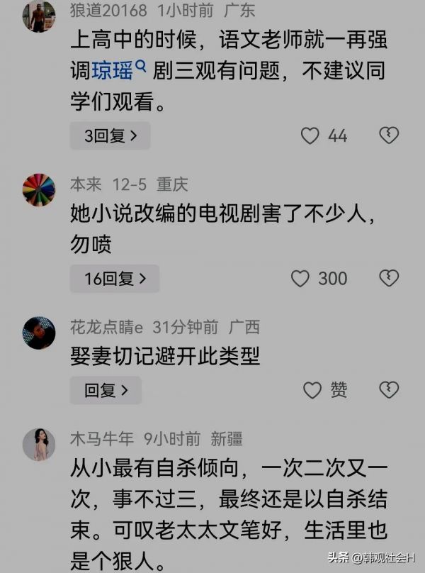 艺术来源于生活,现在想来,琼瑶的那些作品疑似来源于生活中的她自己。上高中的时候,语文老师就一再强调,“琼瑶剧”三观有问题,不建议同学们观看。特别是女孩子看多了琼瑶的作品和“琼瑶剧”,往往会产生胡思乱想的心理。