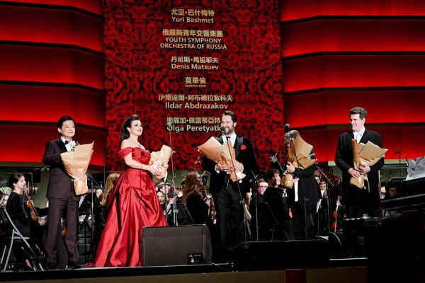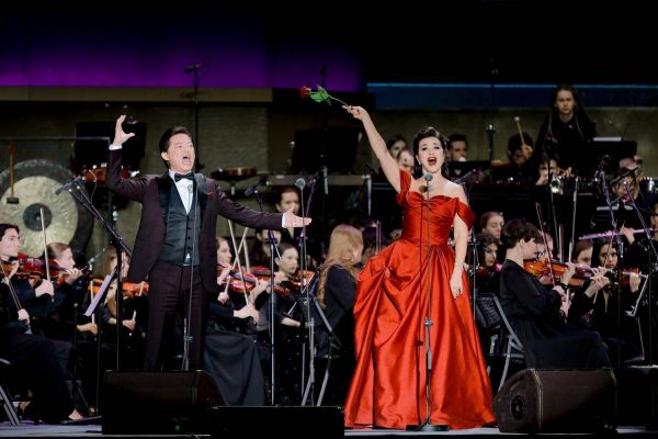 演出曲目覆盖古典与现代,打造出跨越东西方的艺术对话。从里姆斯基-柯萨科夫到威尔第的经典作品,再到中国现代音乐的代表作,每一首乐章都诉说着文化与艺术的深度交融。特别是在第二晚,音乐会达到了情感与艺术的双重巅峰。伊尔达尔·阿布德拉扎科夫和女高音歌唱家奥丽加·佩雷蒂亚特科献上的《瓦兰客商之歌》《斗牛士之歌》《玛尔法的咏叹调》《维奥莱塔的咏叹调》等经典选段张力十足;莫华伦则通过《万里长城永不倒》和《我的太阳》,激发现场观众的强烈共鸣;丹尼斯·马祖耶夫从拉赫马尼诺夫《第二钢琴协奏曲》第三乐章的炽烈与深情,到《黄河》钢琴协奏曲的恢宏气势,将东西方经典作品在演奏中穿插交替,仿佛在讲述一段跨越国界与文化的对话。