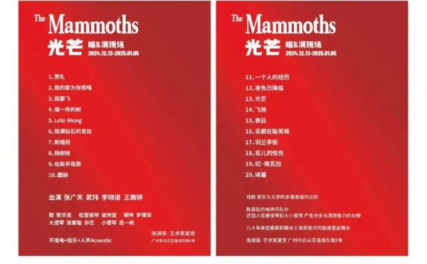 2024年12月13日,《光芒丨唱&演现场》在广州南湖南艺术家夏宫乐剧场拉开第二轮演出序幕。此次演出由著名戏剧家、诗人、音乐家张广天带领自己的三位弟子组成的The Mammoths组合进行演出,三位弟子分别是作曲家武玮、作家李晓珞以及演员王雅婷。