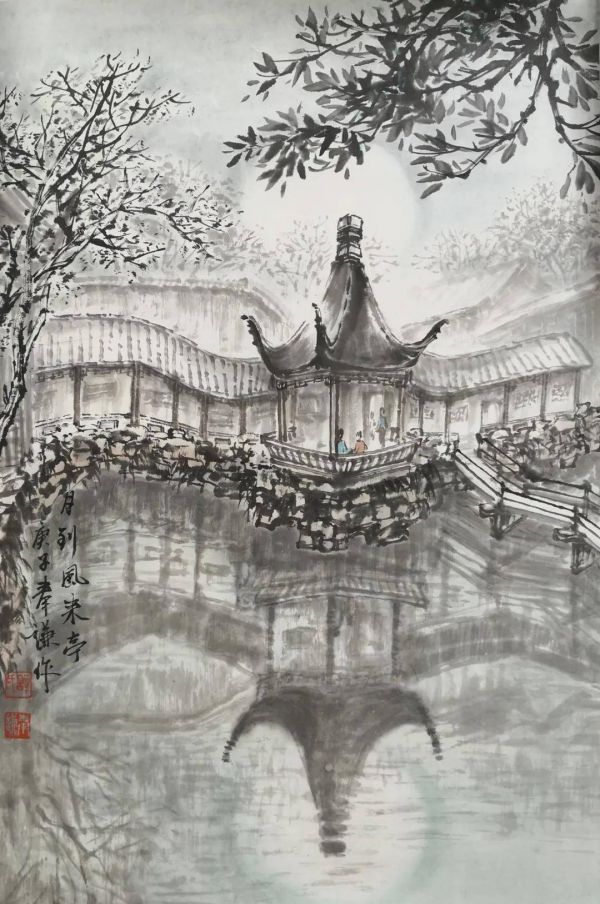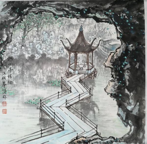 在山水画中,舒奉谦更钟情于江南水乡水墨与彩墨画,说来这也得益于他胞兄舒益谦的影响。舒益谦是吴门江南水乡画的开拓者,他笔下那小桥流水、太湖烟雲、园林美韵对于生于斯长于斯的舒奉谦有着强烈的共鸣。他说:“我自小生于江南,对江南一草一木都充满了深厚的情感,水是江南的灵魂,用水墨来表现水乡之美是最合适不过了,但同时江南的美也是五彩斑瓓的,用彩墨来表现水乡之美也别有一种韵味。”在江南水乡体裁中,舒奉谦最喜画烟雨水乡、太湖景致和古典园林体裁的作品。他喜欢在细雨濛濛的时节走出画室,感受江南别样的美,他说:“小桥流水,乱石铺地,一个小姑娘,一把油纸伞最能体江南朦胧之美,这种美映照在我的脑海中,铺洒在宣纸上,那种酣畅淋漓的感觉真是美妙极了。”