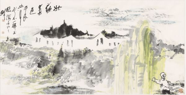 吴立民最为人称道的,是他在“音乐绘画”领域的探索与创新。他将音乐的节奏、旋律与韵律融入画面,使观者在欣赏画作时,仿佛能听到大自然的乐章。例如,他的代表作《江南四月》,通过灵动的墨色变化和柔和的线条节奏,描绘出江南春雨的音韵。这种“听得见的绘画”使他的作品充满了诗意与灵动,令人仿佛置身于音乐与画面的双重艺术享受中。