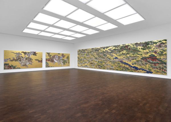 作品大小不一,既适合摆放在建筑的中庭、美术馆展厅,也适合挂在董事会议室或卧房。它们的表面光滑如漆,闪耀着亮泽,如同经过特殊保护以抵御时间的侵蚀。这些以丙烯、金箔和闪光粉构成的作品,散发着其材料特有的油亮光泽。从远处看,像是奢华版的传统日本金箔画、木刻版画或卷轴画。而当走近时,它们则更像是被输入电脑程序后,输出成更明亮、更粗糙、更廉价(实际则价格不菲)的版本。