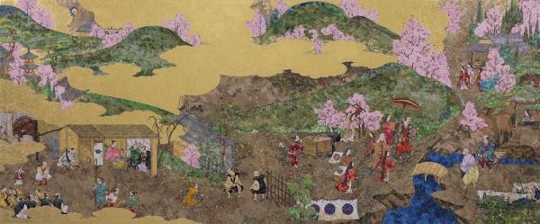 伦敦展览,延续了京都的理念,展览中《洛中洛外图屏风:岩佐又兵卫 RIP》正是村上隆受京瓷美术馆“物之怪”展览委托创作的版本。这件作品以东京国立博物馆藏描绘京都17世纪城市景观的屏风岩佐又兵卫的《洛中洛外图(舟木本)为蓝本,据高古轩资料显示“艺术家试图通过重新诠释历史画作,展现自己对日本艺术叙事的迷恋,并探讨了日本古老辉煌的消逝,并思考了自江户时代后日本向西方开放所带来的新美学与新价值观如何对其产生影响。”展览作品还包括村上隆重绘了日本历史民俗博物馆馆藏的《醍醐花见图屏风》、尾形光琳的《菊图屏风》,《风神雷神屏风》等。