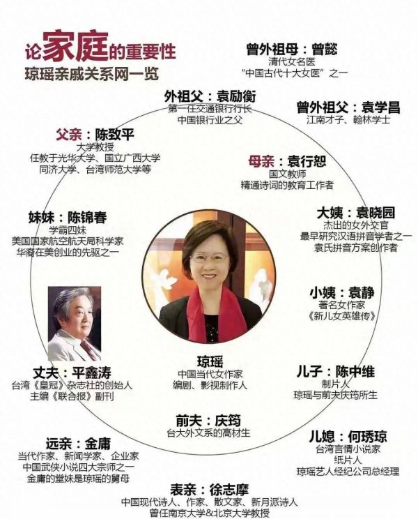 她的舅妈出身于海宁查家,是金庸的表亲,琼瑶按辈分要称金庸一声“表舅”,而金庸的表哥正是近代文学巨匠徐志摩。
