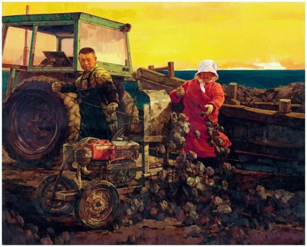 这幅作品不仅在展览中备受关注,其背后所反映的社会现状同样引人深思。据严子宇老师介绍,他当初创作这幅作品主要是想表达中国东部沿海特别是福建沿海地区,靠海的渔民主要通过渔业养殖和捕收来维持生计养家糊口,渔业发展迅速。很多年轻人,特别是夫妻俩,像画中这对夫妻一样,在辛勤劳作,相互配合,夫唱妇随,展现着中国的传统美德。这幅画,我们能清晰看到男女主人公(男子身着捕鱼人常见的防水服饰,方便随时下水去收取挂满海蛎的铁线绳。女子头上戴着白色帽子,白色不吸热,既防晒又防海风。夫妻两人都戴着手套,防止被海蛎壳划伤)以及周围场景样貌(有破晓的天空,深蓝的大海,有年代感的船、车和拖拉机头,颗粒感满满的海蛎等等),被严子宇老师“具象”了出来。每天早上四点多天色未明他们就要出门收割海蛎,海边养殖海蛎用的是铁线,海蛎一整串一整串的,为了快速收割海蛎,必须借助拖拉机头马达,对海蛎进行脱落操作,然后再用麻袋装起来,运往市场出售。随着市民采购时间临近,夫妻二人需尽快收齐海蛎,赶早前往市场,一刻不敢懈怠。