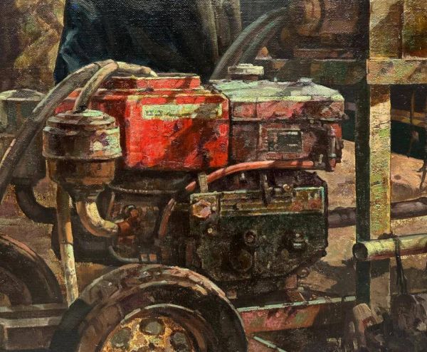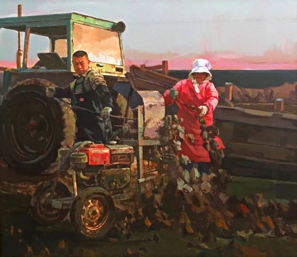 严子宇老师提到,西方油画非常注重光感,光感是光线在物体表面产生的明暗变化和反射效果。光线的强弱、方向以及物体的材质、颜色等都会影响光感的表现。所以他在创作过程中非常注意这些。在这幅《不忘初心 砥砺前行》作品中,渔船上的船杆、拖拉机的发动机头以及轮胎,还有女主人公衣服上的光感都十分强烈。而早晨这个时间点,又刚好是太阳即将升起之时,光感的呈现显得格外重要。