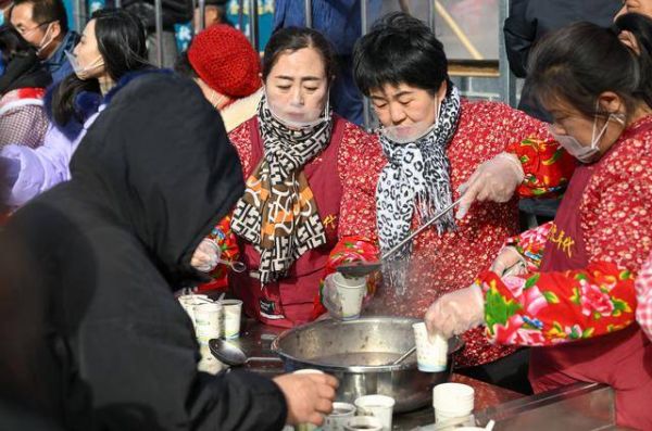 1月7日,在天津芦台大集,工作人员为市民分发腊八粥。新华社记者 孙凡越 摄