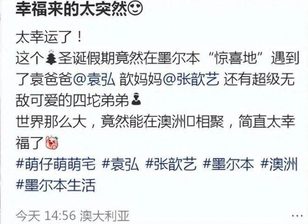 1月7日,童星张梓墨发文称在墨尔本度假时偶遇到袁弘张歆艺一家三口。还晒出了与袁弘一家合照。