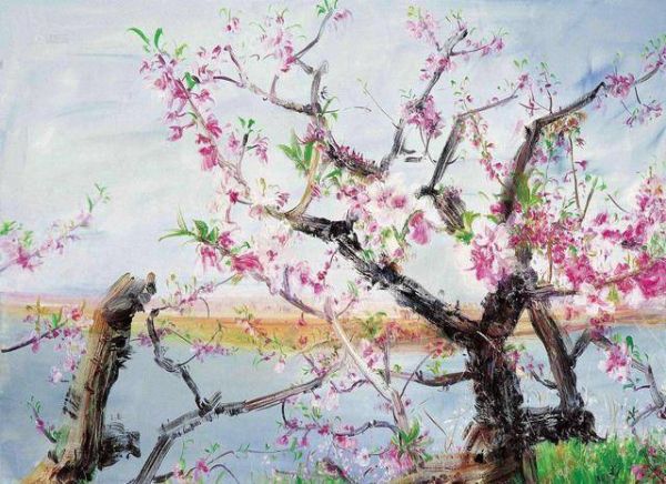 不仅仅是在水墨画上,用油画创作传统国画的形式也经常出现,最为著名的就是他的桃花系列。刘嘉玲就曾经为了求他一幅画,整整等了两年的时间。当然了,在周春芽的绘画道路中,最常出现的还是他的“狗系列”,周春芽对狗狗有着一种独特的关怀,他曾经养过一只狼狗,叫作“黑根”,但是在黑根走了之后,周春芽伤心到两年几乎没有绘画,两年后,本来绘画狼狗的他,却从“暴力”专向了“温和”,开始了桃花系列的创作。