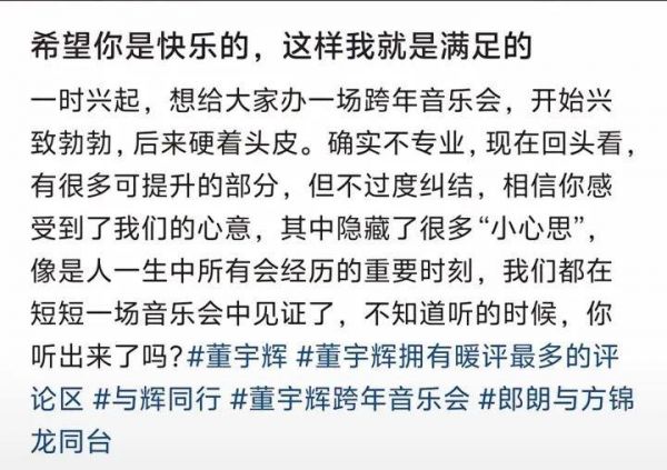 有朋友说,看了与辉同行整场《跨年乐享会》,发现董宇辉小王子发自肺腑的精心准备和完美呈现,不仅抚慰了上一代,共情了这一代,鼓舞了下一代,也温暖了所有的同频者追梦人。正如冯唐老师所言:他不懂权谋,却得了人心。