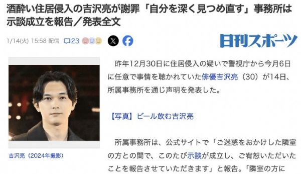 吉泽亮就闯入邻居公寓道歉:我深刻体会到自己的不成熟