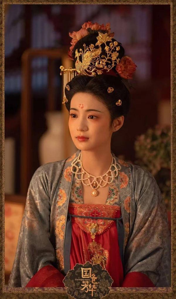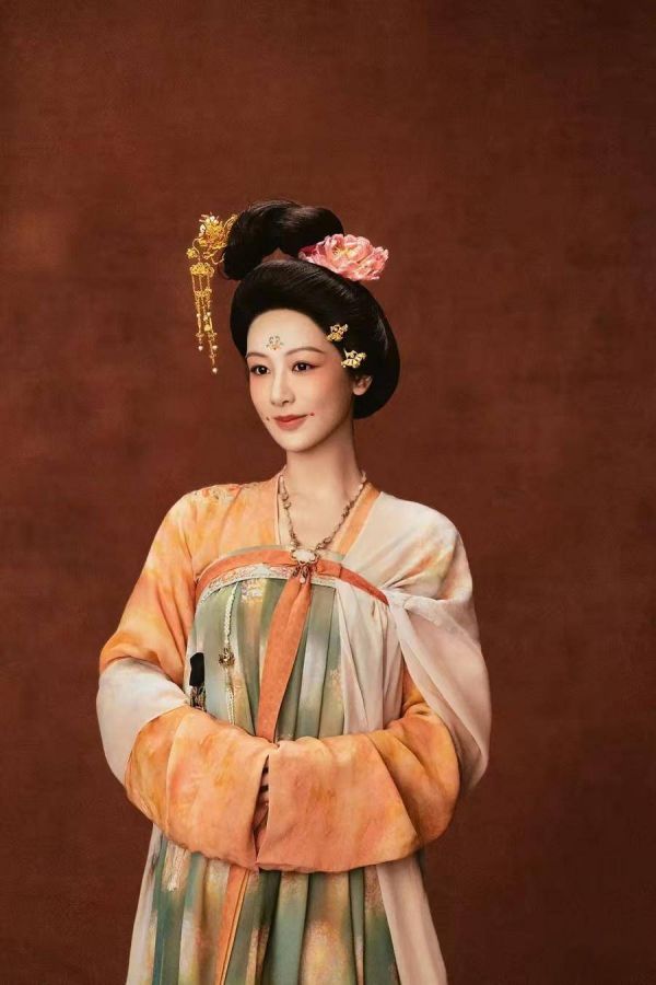 剧中杨紫饰演商户女何惟芳,凭借聪明机智从婚姻中自救,后以牡丹花创业。她的造型大都以齐胸襦裙外加披帛为主,有时还会穿胡服。“唐代的确有女性穿胡服,但通常身份不高,符合女主人公商户女的身份。”不过,同样是胡服女性造型,于颖认为《长安十二时辰》中檀棋的装束更还原,“《国色芳华》里杨紫的服装外形接近,但里面缺一个小领子。”此外,剧中何惟芳常将披帛扎在襦裙系带内,而从唐代壁画来看,披帛通常有两种穿法,一种是插在腰带里绕身围一圈,一种是挂在肩膀或手臂上。