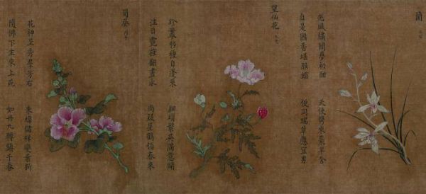 《百花图》卷局部,从左至右分别绘制蜀葵、望仙花、兰。(吉林省博物院供图)