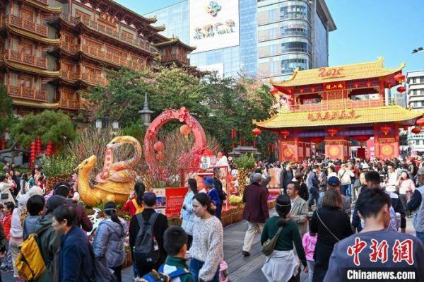 瑞狮跃动,喜气盈门。有“百年花市”美誉的广州越秀西湖花市25日开市,大批市民游客前来“饮头啖汤”。