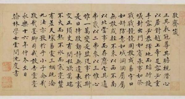 因此,当你再听到有人看不起“馆阁体”时,不妨向他们推荐沈度的《敬斋箴册》。让他们通过这部作品,领略到“馆阁体”的精髓与魅力,重塑对书法的认知。