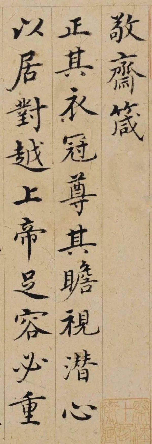 除了技艺和风格上的卓越表现,《敬斋箴册》还蕴含着深远的文化内涵。作品的内容为儒家道德、礼仪教化内涵的箴言,强调了保持敬畏之心和端雅雍容的态度,主张言行举止要符合礼仪规范,并深入探讨了内心修养的重要性。这种文化内涵的融入,使得《敬斋箴册》不仅仅是一幅书法作品,更是一部具有教育意义的经典之作。