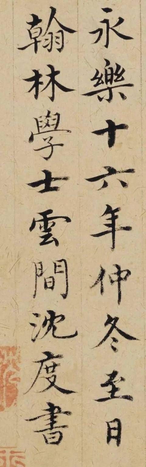 通篇结字匀停,行列齐整,形貌丰润淳和,端雅雍容。沈度的书法笔力劲道,气格超迈,每一个字都仿佛经过精心雕琢,却又显得那么自然流畅。他善于运用中锋行笔,笔画圆润饱满,转折处流畅自然,展现出深厚的书法功底。