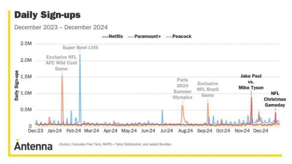 Netflix还在加码对体育直播节目的投资力度,并在第四季度收获丰厚的回报。11月16日,杰克·保罗与迈克·泰森的拳击比赛率先在Netflix登场,从开场到收场的全球平均每分钟观众人数(AMA)达到1.08亿,成为历史上实时观看量最高的体育赛事。来到12月,Netflix接力直播美国职业橄榄球大联盟(NFL)的两场圣诞日赛事,双双录得超过3千万的全球AMA,同样创下NFL比赛的观看纪录。再加上名为“碧昂丝碗”(Beyoncé Bowl)的中场秀,圣诞节NFL比赛的全球社交媒体互动数超过10亿次。有鉴于此,Netflix宣布已获得2027年和2031年国际足联女足世界杯的美国转播权,以期进一步发掘体育直播的富矿。